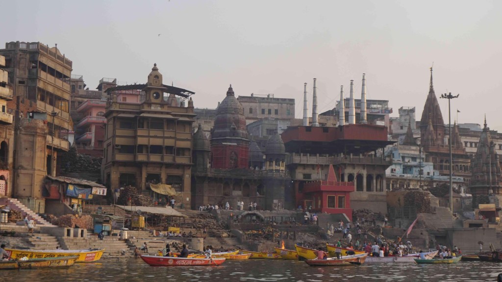 Uma das experiências mais surreais de Varanasi vem do fogo e da carne. São as visitas aos crematórios. Queimar corpos à beira do Ganges (e depois jogar as cinzas nele), um rio sagrado no hinduísmo, é prática comum em Varanasi, uma cidade também sagrada. Por isso a existência dos crematórios ao ar livre. Cada um fica em uma ponta distinta do “circuito dos ghats” e um deles é bem pequeno se comparado ao outro. O crematório principal é uma visão quase lisérgica, uma mistura de fogo, animais, madeira, cinzas, água e fezes. Não é só que pessoas estão sendo queimadas em piras ali na sua frente, bem perto do rio, mas todo o resto do cenário é estranhamente bonito, como se pequenas partes erradas conseguissem formar um todo magnífico. As ruínas que fazem parte do ghat dão um tom certeiro de decadência histórica (e digo isso no melhor sentido possível). Elas são habitadas pelas pessoas que vão para Varanasi para morrer e estão “esperando sua hora”. Parte da tradição é que Varanasi é especialmente auspiciosa para morrer, segundo a crença falecer lá é uma forma de quebrar o ciclo de reencarnações. Por isso as moradias decrépitas cheias de anciãos a espera da facada temporal.