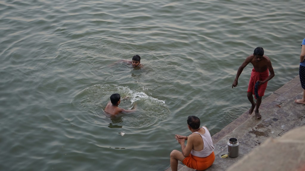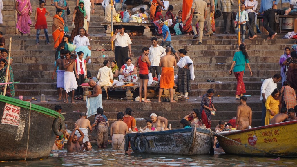 Quero só estressar aqui um dos pontos que mencionei acima. As pessoas se banham no Ganges como se não houvesse amanhã, o que para nossa percepção ocidental é basicamente o mesmo que brincar todo dia de roleta-russa. Ao ler um pouco sobre Varanasi é fácil se deparar com a informação de que o Ganges, naquela altura, é bem poluído. Tem de tudo ali, inclusive pedaços humanos que podem passar boiando por você durante uma nadada matinal. Mas isso não impede os moradores, que tem uma relação profunda com o rio e provavelmente um sistema imunológico avantajado, de aproveitarem o Ganges. Eles nadam por diversão, tomam banho, lavam roupas e até bebem a água. A indicação é para que não locais não façam o mesmo e eu vou dizer que não fiquei tentado a fazer. Vi um ou outro ocidental brincando dentro das águas, por isso não sei o quanto esse “medo” do rio é verdade. Mas eu não estava em um bom momento da minha vida para enfrentar uma super-bactéria, por isso não arrisquei.