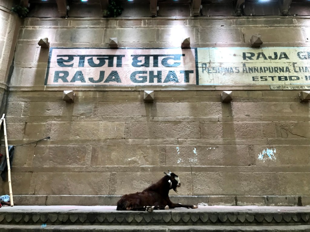 Varanasi é também conhecida por ter uma relação antiga e ritualística com substâncias que alteram o estado mental e seria pouco imersivo ir até um local desses e não se jogar no processo. Tomamos um lassi (iogurte local) levemente adulterado e saímos para experimentar toda glória da cidade com a percepção mais ajustada para a loucura local. Foi uma das noites mais memoráveis da viagem. Apenas eu, a Marina e nossas tagarelices de pouco sentido. É de uma superficialidade notória de viajantes desgraçar uma experiência religiosa dessa maneira, mas este é um sacrilégio que não me arrependo de ter cometido. Afinal foi nessa noite em que fomos acometidos por um ataque de culpa ao visitar um templo longe das nossas melhores condições, em que fizemos uma importante análise sociopolítica da Índia quase caindo dos degraus de um dos ghats e o mais importante, foi quando conhecemos nosso amigo bode. Como já disse a cidade é também tomada por animais, principalmente vacas, mas durante uma caminhada pelos ghats vimos esse bode que era quase do tamanho de um cavalo. Um exemplar mastodôntico do género Capra. O estado mental do momento nos impeliu a admirá-lo e tentar até puxar um papo, mas ele era era tímido e não respondeu. Ainda bem que as raízes do bom-senso me impediram de tentar montar no admirável ser, mas que eu quis, eu quis.