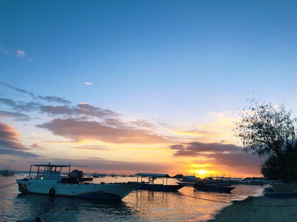 Normalmente os passeios até Kalanggaman são bem básicos, os barcos chegam, ficam algumas horas e voltam antes do fim da tarde. Mas se você pagar a taxa da barraca e do pernoite pode capotar por lá. Foi o que fizemos e, graças a isso, presenciamos o melhor pôr do sol que já vi até hoje. Eu sei que tenho uma fixação em falar sobre pôr do sol, mas juro que esse foi emocionante.