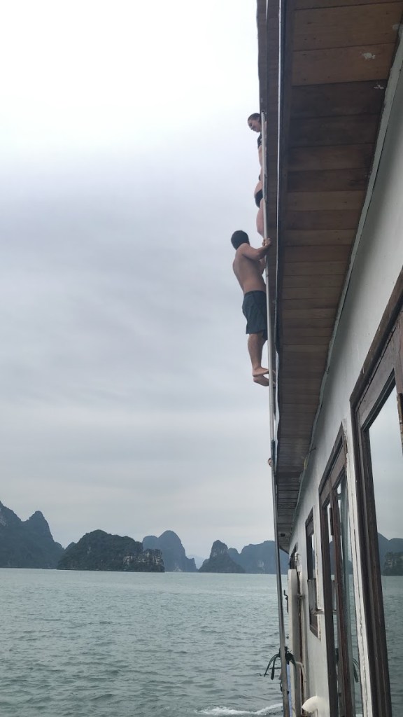 Já era quase ano novo e precisávamos estar na capital, pois fechamos, junto com uma amiga da Marina que estava de férias no Vietnã, um cruzeiro em Ha Long Bay, um dos destinos mais turísticos do país. É um lugar surreal, apesar de super visitado. Um verdadeiro labirinto formado por milhares de grandes rochedos de calcário que emergem do mar cor de jade e criam desenhos únicos na água junto com piscinas naturais, ilhas e cavernas misteriosas. São como restos de uma antiga cidade perdida que foi parcialmente inundada. Ruínas do fantástico. Escombros de um lugar que existe só na imaginação. Bom, deu para perceber que visualmente o lugar é incrível e que eu me empolguei na minha descrição.