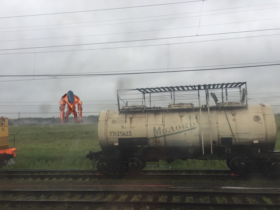 Aliás pegamos um resto de verão bem potente durante quase todo percurso, foi estranho acompanhar as paisagens “com vida” que passavam pela janela. Eu esperava ver aquela Sibéria melancólica, desbotada e reflexiva, quase como os cenários de um filme do Tarkovsky. Ao contrário, pegamos bastante sol e muito verde, mas ainda era a Sibéria. Casas de madeira naquele estilo único que não sei descrever (veja foto, é mais fácil), construções industriais abandonadas, muitos pinheiros e toda aquela vegetação da tundra (que se intensifica muito a partir de Ekaterimburgo) foram presenças certas no show que rolava fora do vagão.