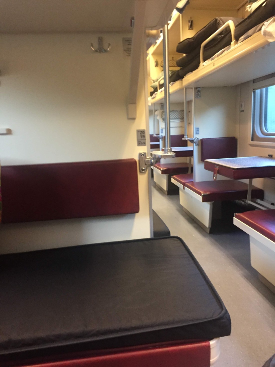 Claro que quem está nas camas inferiores tem mais controle sobre o terreno da alimentação, afinal a mesa está ali a poucos centímetros de alcance, por isso, e pela comodidade de não ficar escalando toda hora, os locais inferiores esgotam mais rápido nos trens. Mas é aí que entra a etiqueta da locomotiva, que fomos aprendendo aos poucos, em que é aceitável que as pessoas do beliche de cima fiquem sentados, como em sofás, nas camas inferiores, pois elas precisam usar a mesa em algum momento e, por mais que essa seja uma afirmação contra intuitiva, se enchem o saco de ficarem deitadas o tempo todo (mal da pra sentar nos lugares de cima).